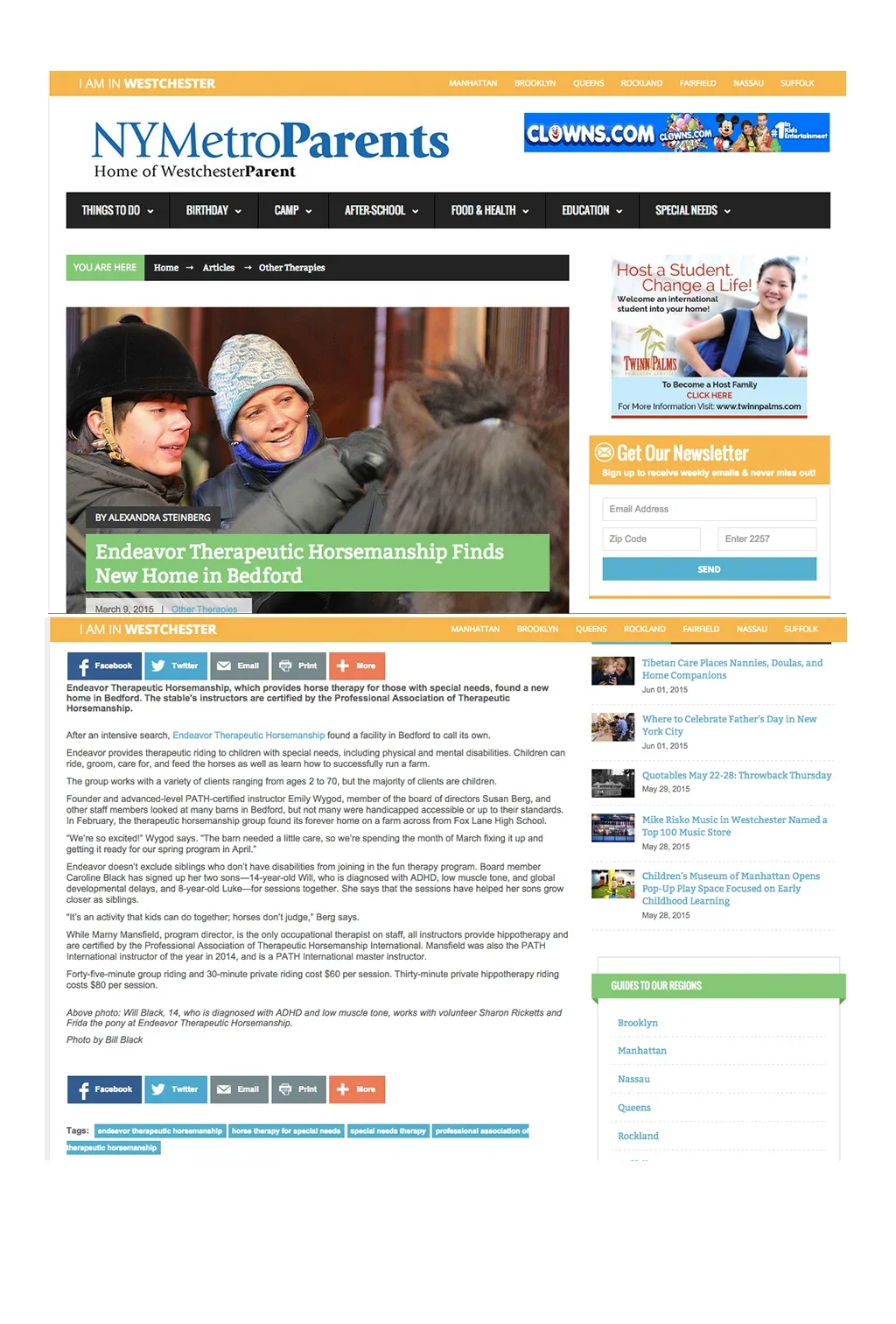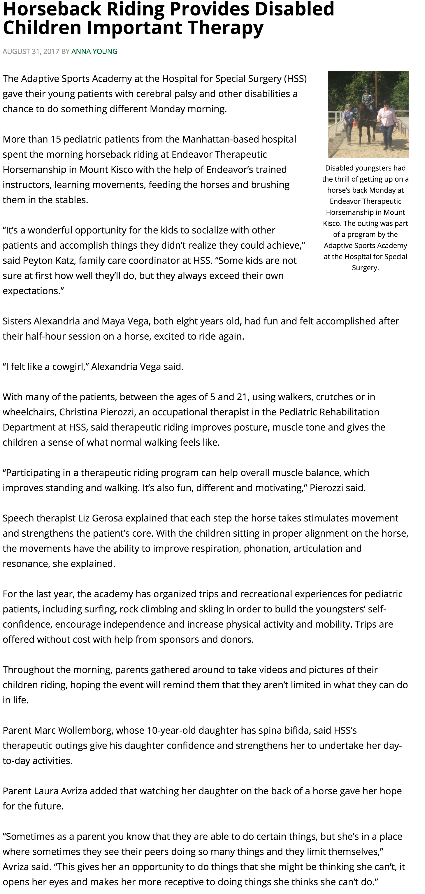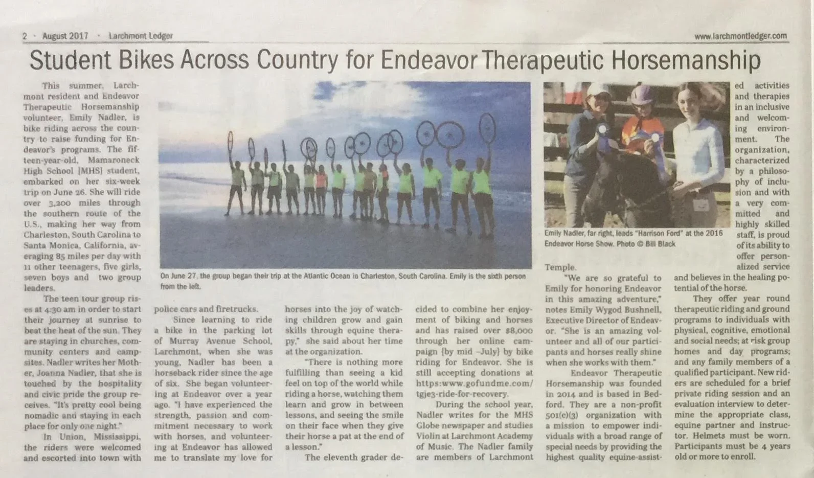 The Larchmont Ledger wrote a feature article on volunteer, Emily Nadler, and her fundraising campaign for Endeavor in August 2017.