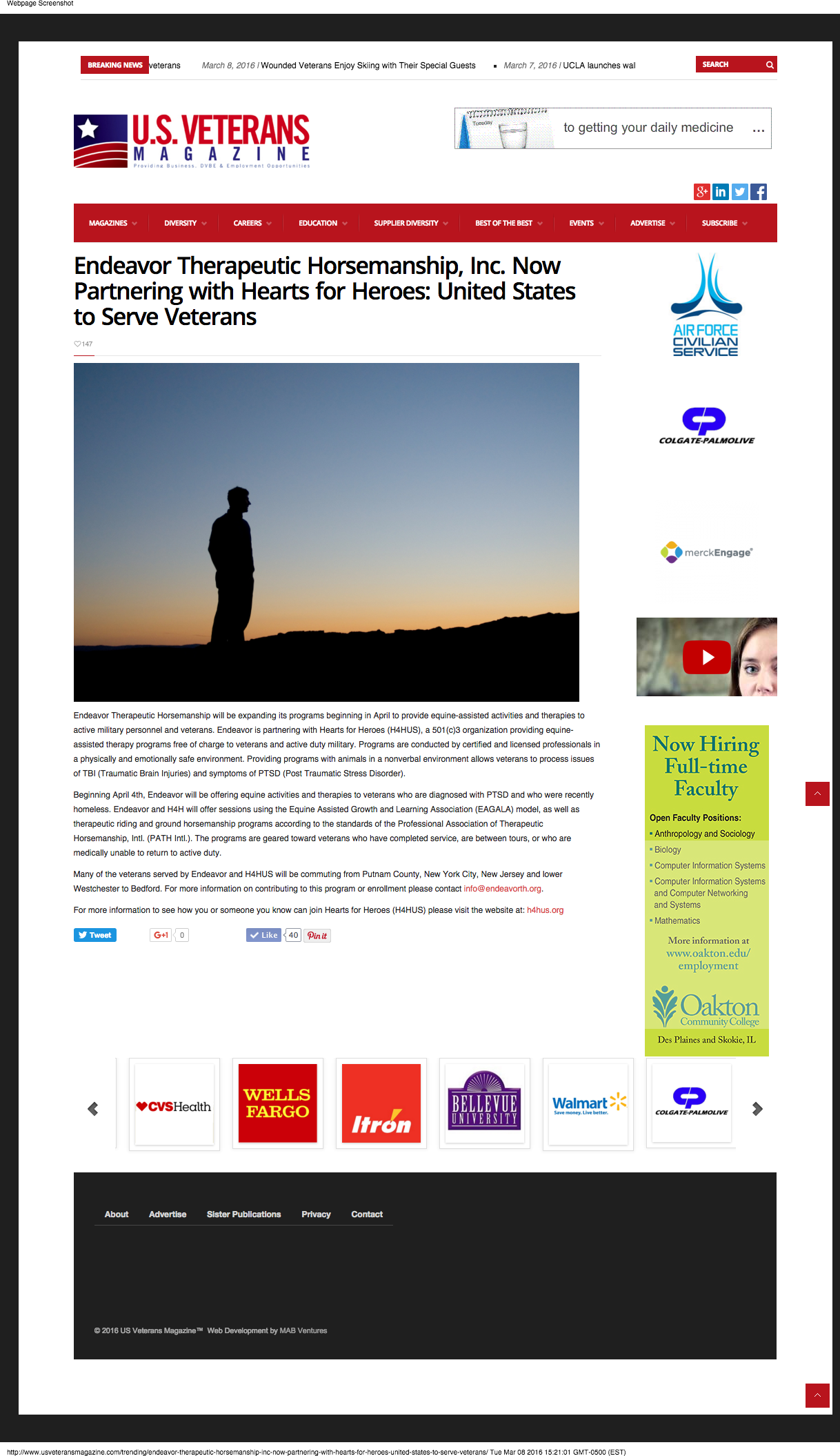 U.S. Veterans Magazine featured Endeavor in March, 2016.
